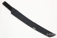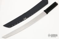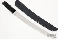 This wakizashi by Pohan leu has a satin finished scandi ground blade with .125" blade stock and 1.569" blade depth, full/hidden tang construction. Handle is black cord wrap over black stingray skin. Comes with a kydex sheath. Extremely sharp. Excellent condition.