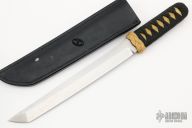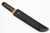 This Special Aikuchi by Phill Hartsfield features a double ground tanto style blade with .246" blade stock and 1.166" blade depth. The handle is comprised of a yellow and black Japanese style wrap over epoxied cord, full/hidden tang construction. Includes a black leather sheath with belt stud by Paul Long. Has some light spotting on the blade, otherwise excellent condition.