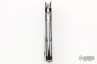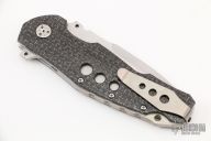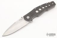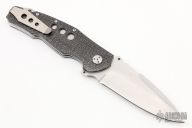 This N° 308 linerlock flipper by Sergio Consoli features a hand rub satin finished blade with a flipper. The handle has silver lightning strike carbon fiber scales, titanium tip up clip, Inox steel liners, and an titanium backspacer. Nice lockup, blade seating and detent. Rides on bearings. Includes COA dated October 2015, and a zippered case. Has some light scratches on the clip and backspacer,therwise excellent condition.