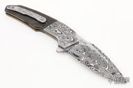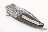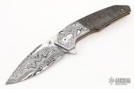 This Tashi Bharucha designed flipper by Andre Thorburn and Andre van Heerden features a spear point Damasteel blade with a false top edge, notched thumbrest and flipper. The handle has Damasteel bolsters, marble carbon fiber scales over anodized titanium liners, carbon fiber backspacer and Damsteel tip up clip. Includes a zippered case. Nice detent, lock up and blade seating. Excellent Condition.