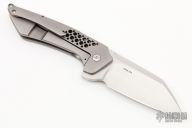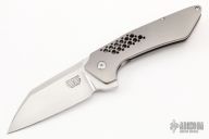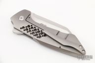 This Alien by Tashi Bharucha features a hand rub satin finished blade with flipper. The handle has a bead blasted titanium frame with hole pattern, holes are matching on both sides of the frame, a matching backspacer and tip up clip. Nice detent, lockup and blade seating. Comes with a zippered case. Has a couple light scuffs, otherwise excellent condition.