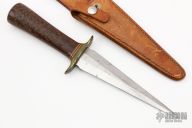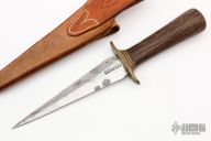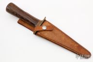 This Model 13-6 Small Arkansas Toothpick by Randall Made Knives features a double edged blade with .196" blade stock and 1.313" blade depth, hidden tang construction. The handle has a brass guard, red, white and blue spacers, wood grip. Includes Johnson Roughback Leather sheath with belt loop. Has patina on the blade, has some scratches, otherwise good condition for its age.