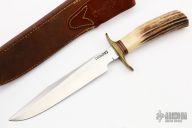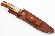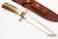 This model 1-7 by Randall Made Knives features a satin finished clip point blade with sharpened top edge, .206" blade stock and 1.108" blade depth, hidden tang construction. The handle has a brass guard, stag grip and red, white and blue spacers. Includes a brown button rough back brown leather sheath. Has some light scratches, otherwise excellent condition for its age.