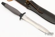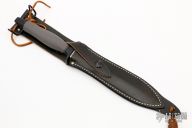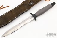 The Mark II is one of the best selling knives of all time. First introduced in 1966, this tactical knife is serialized for collectors. This one has a satin finished hand ground double edged partially serrated blade, .252" blade stock and .968" blade depth, hidden tang construction with a black/grey aluminum handle. This knife is Serial #052744 and was made in 1976. Comes with a brown leather sheath. Has some light scratches, wear and patina, otherwise good condition for its age.