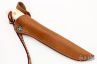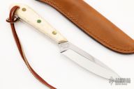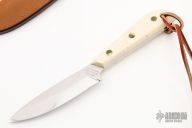 The belt Knife by Grohmann Knives and DH Russell features a mirror polished drop point blade with a notched thumbrest and a full tang construction, .112" Blade Stock .956" Blade Depth. The handle has bone (i think it might actually be oosic, but i could be wrong) scales. Includes a brown leather sheath. Excellent Condition.