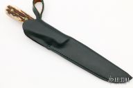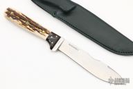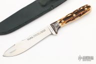 This Huntsman's Knife by Puma-Werk Knives features a satin finished blade with notched spine and false top edge, .208" blade stock and .989" blade depth, full tang construction. The handle has natural horn bolsters, stag scales. Includes original leather sheath, box and papers. Excellent Condition. The blade is marked "Abercrombie & Fitch Co. Made in Germany"