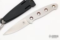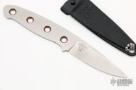 This knife features a satin finished drop point blade with an integral construction.  .119" Blade Depth.  .870" Blade Depth.  Includes a black plastic sheath with a bead chain. Scratches are visible on the blade and handle otherwise the knife is in good condition.