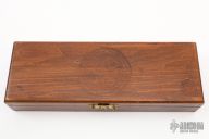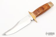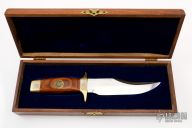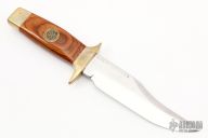 This fixed blade by Smith and Wesson features a wood handle with brass guard and butt cap. Mirror polished bowie style blade with 1/4" blade stock and 1 1/4" blade depth. Has "Texas Rangers 1823-1973" stamped on blade and a "Texas Rangers Commemorative Commission" inlay on handle. Excellent condition. Includes a wooden display box.