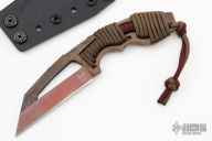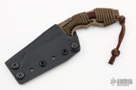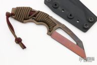 This POGN wharncliffe fixed blade from Bawidamann Blades has a CPM Cruwear skeletonized blade with notched thumb rest and a custom patina finish. Handle is paracord wrapped, with contoured finger choils and lanyard. Great fixed blade for EDC and very easily concealed and the aggressive wharncliffe blade makes this a great choice for self defense. Comes with the Bawidamann Uberscabbard system for multiple carry options. Has some scratches, otherwise good condition.