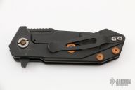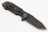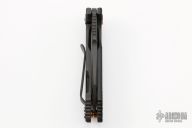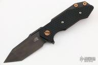 This Half Track from Hinderer Knives features a black tanto blade with swedge, fullers, notched thumbrest and flipper. The handle has a black DLC titanium frame with a black G-10 scale, copper hardware. Titanium clip is positioned for tip up, right hand carry. Comes with original box and hardware. Has some scuffs and scratches, otherwise good condition.