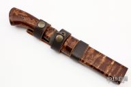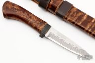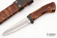 This knife features a two-tone Damascus blade with a hidden tang construction.  .168" Blade Stock.  .995" Blade Depth.  The handle features an iron clad guard and a wood grip.  Includes a matching wood saya.  One of the buckles on the sheath is busted otherwise the knife is in Excellent Condition.