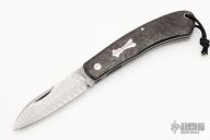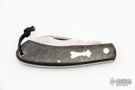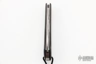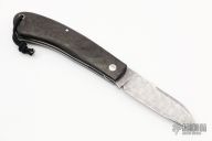 This Dino by Tom Ploppert features a Damasteel blade with nail nick. The handle has marble carbon fiber covers with stainless steel escutcheon, stainless steel liners and a CPM154 spring, lanyard hole. Comes with zippered case and COA. Has half-stop, flush in all positions. Has some scratches on the spine of the handle, otherwise excellent condition.