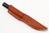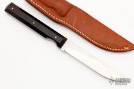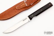 This Model 10 Salt Fisherman and Household Utility features a satin finish blade with swedge and notched thumbrest, .115" blade stock and .857" blade depth. The handle is comprised of black linen micarta scales over full tang construction. Brass pins. Includes a brown leather sheath. Excellent condition.