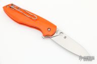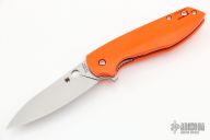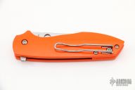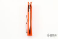 This Positron by Spyderco is a Brad Southard design, it features a satin finished blade with notched thumbrest, thumbhole and flipper. The handle has an orange G-10 frame and backspacer with stainless steel liner and a tip up paper clip style clip, left or right reversible. Comes with original box and papers. Excellent condition.