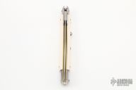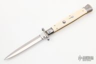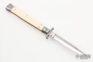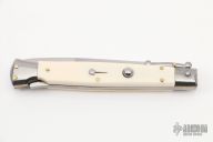 This 11" Swing Guard Auto by Frank Beltrame features a polished dagger ground blade with false top edge. The handle has stainless steel bolsters, front and rear, imitation ivory scales, brass liners, stainless spring. Excellent Condition.