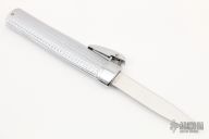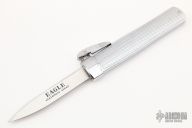 This is the Eagle Gravity knife sold in the 1980s by The Edge Knife Company. Many recall this discontinued knife and it has become almost impossible to find today. We have come across a number of these from a closed knife store, these are new old stock and are in unused condition. It is a great copy of the Anton Wingen Othello gravity knife, made in Solingen Germany. Enthusiasts have debated whether this was made in Taiwan or Japan. However, we checked with the original exporter of this knife in Japan and found that it was actually made in Seki, Japan in the 1980s. It is all metal construction with chrome finish on handle and the blade is 440 stainless and is factory sharpened. Push the lever and flick the wrist or push with blade pointing down and it slides into the open position. Point blade upward and push the button and it falls into the closed position. Excellent condition.