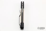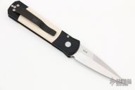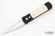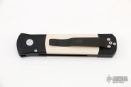 This side opening auto features a satin finished spear point blade with a false top edge. The handle has a black aluminum frame with ivory micarta scales and a black stainless steel clip, tip up carry. Comes with original box and papers. New From Maker!