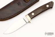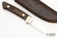 This Loveless Style Utility from John April features a polished clip point blade.  .198" Blade Stock. .944" Blade Depth. The handle has a nickel silver guard with brass pins and brown canvas micarta scales with nickel silver and steel pins and nickel silver lanyard tube over red liners and full tapered tang construction. Includes leather sheath with belt loop that is stamped #119.  Excellent Condition.
