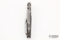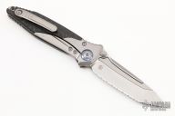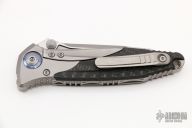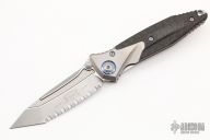 This Socom Bravo by Microtech is made in China by Rike Knife, it features a bead blasted blade with a fully serrated edge, notched thumbrest, and dual thumbstuds. The handle has bead blasted titanium bolsters/liners, anodized pivot collars, carbon fiber scales. Tip up carry bead blasted titanium clip. Bead blasted titanium backspacer. Dated 04/2022 and s/n 1180. Comes with original box and papers. Excellent condition. Box signed by Tony Marfione.