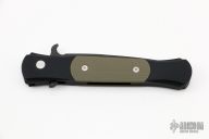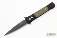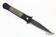 This Don by Pro-Tech features a dark black finished blade with false top edge. The handle has a black aluminum frame with G10 inlays. Comes with a Pro-Tech box. P2_232. Excellent condition.