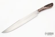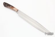 This Long Bowie by Master Smith John Fitch was made while he was an apprentice in the ABS. It features a flat ground blade with a hand rubbed satin finish and false top edge, .236" blade stock and 1.713" blade depth, full tapered tang construction. The handle has stag scales with nickel silver pins. Comes with a zippered case. Has some light scratches and some light pitting on one side of the blade, otherwise good condition for its age.