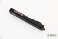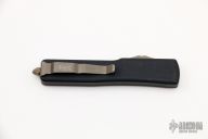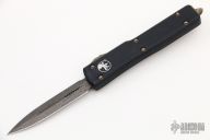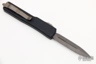 This UTX-70 OTF automatic by Microtech features a Damascus blade with a standard edge. The handle has a black aluminum frame with blasted stainless steel tip down clip. Serial number 174 and dated 02/2019. Comes with original box and papers. Excellent condition.