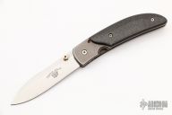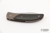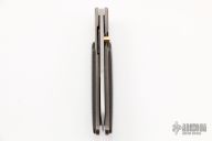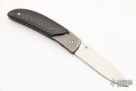 This Baby folder by Bob Terzuola features a tumbled blade with single gold thumbstud. The handle has a tumbled titanium frame and liner with carbon fiber scales, anodized and orange peel finished titanium backspacer. Nice detent and blade seating, has a little vertical blade play. Has a few light scuffs, otherwise excellent condition.