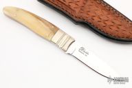 This Utility from D'Alton Holder features a mirror polished blade with .124" blade stock and .756" blade depth, full tapered tang construction. The handle has fluted and dovetaled nickel silver bolsters and sheep horn scales and nickel silver pins. Excellent condition. Comes with a hand tooled brown leather sheath.