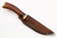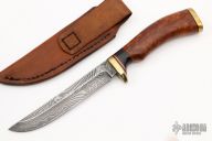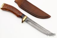 This Hunter by Ray Coon features a Damascus blade with .152" blade stock and .842" blade depth, hidden tang construction. The handle is comprised of brass guard and pommel with red/brass/ebony spacers and a maple burl grip. Includes leather sheath with belt loop. Has a spot on the blade, otherwise excellent condition.
