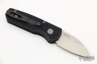 The Runt 5 by Pro-Tech Knives features a tumbled sheepsfoot style blade. The handle features a textured black aluminum handle with a black tip up stainless steel pocket clip. Includes the original box and papers. Excellent Condition.