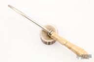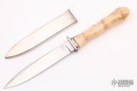 This Dagger by Master Smith Bailey Bradshaw features a hand rub satin finished blade with .107" blade stock and .764" blade depth, hidden tang construction. The handle has a stainless steel guard and a hand carved fossil walrus ivory grip. Comes with an engraved nickel silver scabbard and a zippered case. Excellent condition.