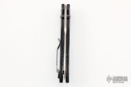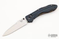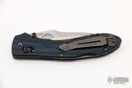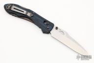This 930BK Kulgera from Benchmade features a black recurve blade with swedge and dual thumbstuds. The handle is comprised of blue and black G10 scales over black steel liners and stand-offs. Stainless steel tip up clip is reversible for left or right hand carry. Comes with box and soft pouch. Has a couple light scuffs on the clip otherwise excellent condition.