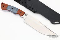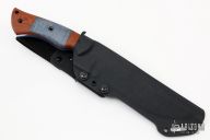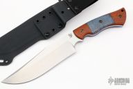 This OG Grizly by Dark Timber Knives features a stonewashed blade with satin flats, .250" blade stock and 1.956" blade depth, full tang construction. The handle has natural canvas micarta scales with dovetailed dyed maple inlays and blue G-10 liners. Comes with another set of scales that are black canvas micarta with dovetailed maple inlays and blue G-10 liners. Comes with a kydex sheath and original box. Excellent condition.