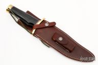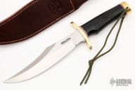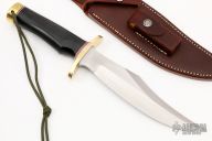 This Model 12-8 Bear Bowie from Randall Made Knives features a satin finished stainless steel blade with a sharpened top edge, .215" blade stock and 1.692" blade depth, hidden tang construction. The handle has a forward curved brass guard and butt cap, single finger grip style black linen micarta grip with red/white/blue spacers, lanyard hole at the butt. Comes with a brown leather sheath and original paper wrapping. Excellent condition.