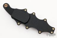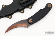 This Elvia by Turner CNC features a HT Oxide finish blade, .183" blade stock and 1.15" blade depth with full tang construction. The handle has a milled checkered black g10 scales. Comes with a kydex sheath and the knife will fit in either direction, original box, and COA. 60HRC with Cryo. Excellent condition.