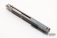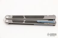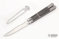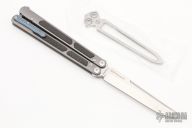 This Balisong by Maxace Knives features a satin finished clip point blade with false top edge. The handle has blasted titanium handles with carbon fiber inlays, anodized titanium backspacers, tip up clip and T-latch. Comes with original box, zippered case with trainer blade and extra hardware. New from maker.