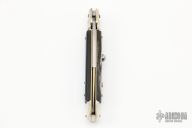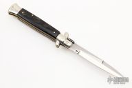 This 9" Picklock by Frank Beltrame features a satin bayonet ground blade with false top edge. The handle has stainless steel bolsters, front and rear, horn scales, brass liners, stainless spring. Has a few light scratches, otherwise excellent condition.