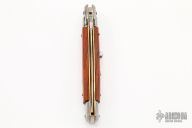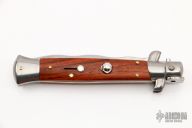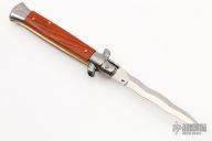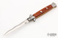 This 9" swivel bolster auto by Frank Beltrame features a Kris ground blade with false top edge. The handle has stainless steel bolsters, front and rear, wood scales, brass liners, stainless spring. Excellent condition.