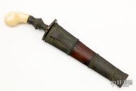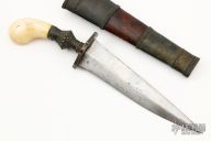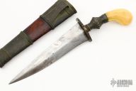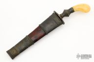 This Dirk features a dagger style blade with a hidden tang construction.  .148" Blade Stock.  1.476" Blade Depth.  The handle features antique metal fittings and an ivory grip.  Includes a wood and metal scabbard.  Oxidation, scuffs and scratches are visible on the knife and scabbard.  This knife is from the Morro tribe in the Philippines.