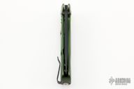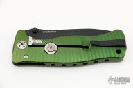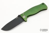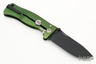 This SR-1A OB by Lion Steel features a black coated drop point blade with dual thumb studs and notched thumb rest. The handle is comprised of an green anodized integral aluminum frame. Features the rotoblock system which allows the blade to be locked open. Nice blade seating, detent and lockup. Includes original packaging and paperwork. Excellent condition.