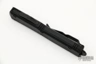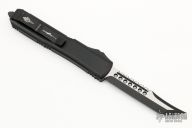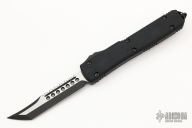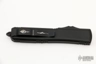 This Ultratech Hellhound by Microtech Knives features a black DLC and satin finished blade with notched thumbrest and fullers, false top edge. The handle has a black G-10 and black aluminum frame with tip down black stainless steel clip, black hardware and thumbslide. Comes with original box and papers. Excellent condition. Dated 05/2018.