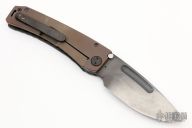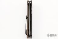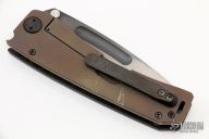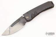 This Marauder by Medford Knives features a blackened drop point blade with fullers. The handle has a carbon fiber scale, and a tumbled/anodize finish titanium frame with a D2 skull crusher at the butt and flamed tip up clip. Nice detent, lockup and blade seating. Comes with original box and papers. Has some light scratches on the lockside. Great condition otherwise.