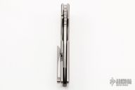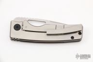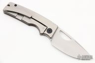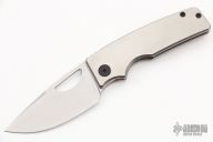 This knife by the OZ Machine Company features a tumbled Magnacut blade with thumbhole and notched thumbrest. The handle features a smooth tumbled titanium frame with a black titanium backspacer and tumbled tip up clip with hidden screws. Includes box and papers dated 7-28-22 and s/n 815. Excellent condition.