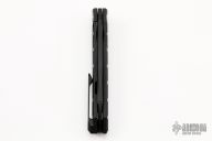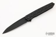 This Cypher Mini Dark by Deryk Munroe features a dark acid/tumble finished blade with fullers, a notched thumbrest and flipper. The handle has a dark acid/tumbled titanium frame, a matching titanium backspacer with lanyard hole, titanium tip up clip with hidden screws, and stainless steel lockface insert/internal over travel stop. Nice detent, lockup and blade seating. Rides on caged ceramic Si3N4 bearings. Comes with original box and papers. Has a couple light scratches, otherwise excellent condition.