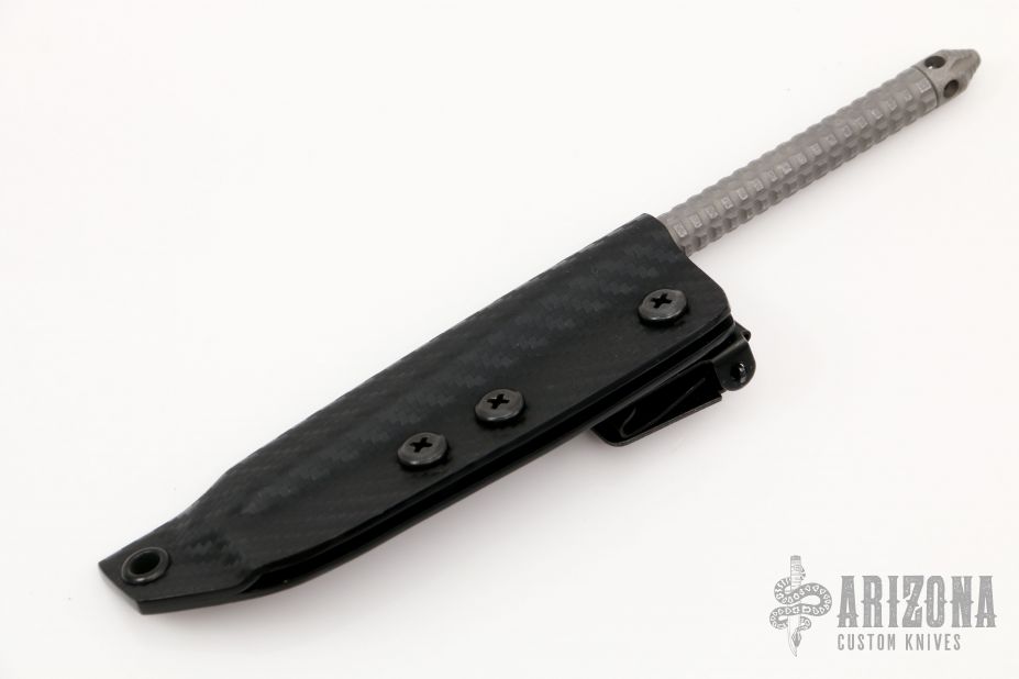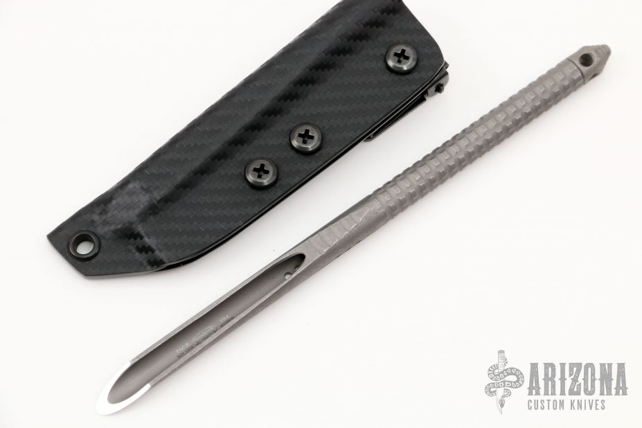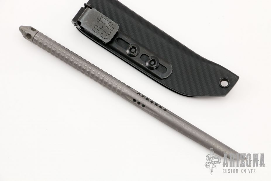 The Microtech TAC-P is a tactical spike with a wicked U' needle tip. The handle is jimped for a sure grip and it features a glass breaker and lanyard hole. This one has an apocalyptic finish. It includes a carbon fiber print kydex sheath with an Ulti-Clip. Comes with original box and papers. Excellent condition. S/N 1936 and dated 07/2020.