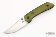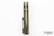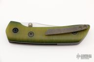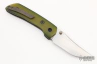 This Calico Jack by Patrick Doyle features a hand rub satin finished blade with a dual titanium thumbstuds and a swedge. The handle has translucent yellow G-10 scales with black liners, anodized and tumbled titanium liners, stippled and anodized titanium tip up clip and backspacer, Teflon washers, ceramic detent. Nice detent, lockup and blade seating. Comes with a zippered case. Excellent condition.