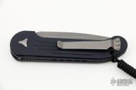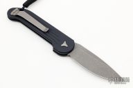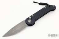 This LUDT side opening automatic by Microtech has an Apocalyptic finished blade with a standard edge and a contoured grey/navy blue aluminum frame. Stainless steel clip. Dated 02/2020 and serial number 17015. Comes with original box and papers. Excellent Condition.