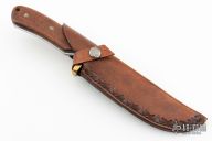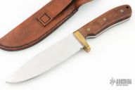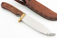 This knife by Frank Eaton features a mirror polished drop point blade with .176" blade stock and 1.444" blade depth, full tang construction. The handle has a brass guard and wood scales with mosaic pins. Comes with a brown leather sheath. Has a few light scratches, otherwise excellent condition.