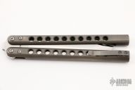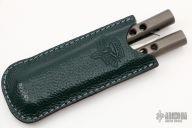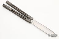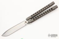 This Faust by Atropos features a satin finished blade. The handles are channel construction tumble finished titanium with a tip up titanium clip. Comes with original leather sheath and zippered case. Has a few light scratches, otherwise excellent condition.