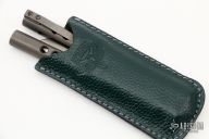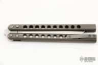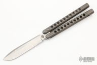 This Faust by Atropos features a satin finished blade. The handles are channel construction tumble finished titanium with a tip up titanium clip. Comes with original leather sheath and zippered case. Has a few light scratches, otherwise excellent condition.